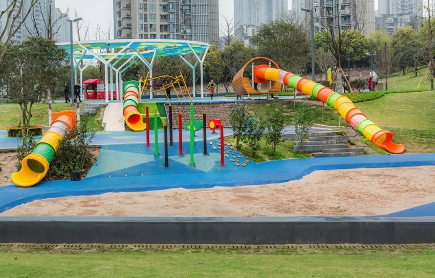 公园地处重庆大渡口区北部,双园路、山川路和山河路交叉处,周边分布着密集的居住区,区内缺少大型活动场地。从周边居民的实际需求出发,设计团队充分利用场地原有资源,以体育文化为核心,打造了一个满足全年龄活动的社区公园。