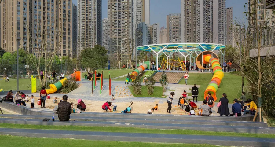 据相关部门统计,重庆心湖北体育文化公园自开放后,日均人流量达到3300多人次,除了周边居民,街道、学校也常常来此举办活动。从住区到社区,从公有到共有,边角公园进一步扩大人与人的交往空间,提供了更多样的生活方式。