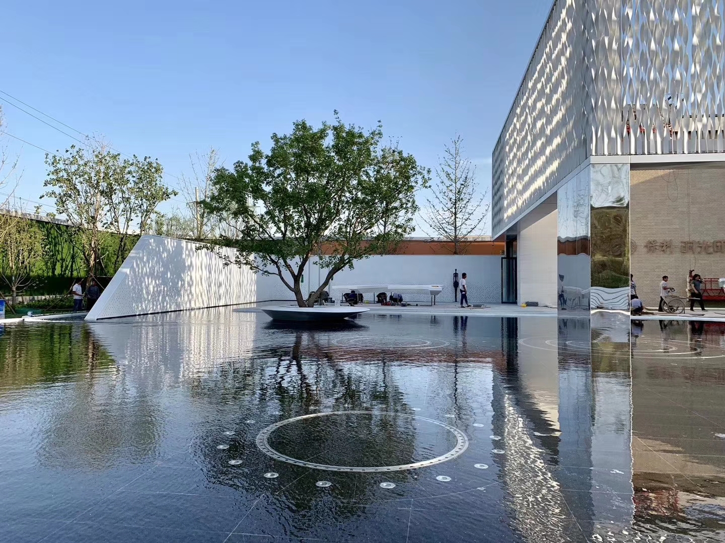 展示区采用极简主义理念的手法设,主入口流线型铺装以及带状水景为展示区景观打造一流的视觉动线,同时采用近2000㎡镜面水景强调出建筑品质感,实现了极简主义设计手法与都市生活理念的碰撞。主入口宛若山丘状的特色花坛镶嵌灯带处理,结合麦穗草丛灯营造出都市时尚感;主入口大型镜面水落地过程采用白色金属池壁与星星灯相结合的手法,夜间池底将产生一幅完整的星空图案。