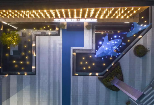 微风拂动,星沉浪涌,跳跃的水柱,像鲸鱼的每一次呼吸,落入泛起涟漪的水中,为繁华喧闹的商业街增添了几分闲适,水景辉映着华灯与建筑,水波跃动中带着舒服、亲和、宁静,围坐畅饮,一起聊聊,星星究竟在水里,还是在天际,银碎细闪,是阳光追逐希望而来。俯下身去,捞起一把沁透心脾的凉,场景中的水声、阳光、波纹,自然而然带动人与景观互动,嬉戏浮潜深海中。