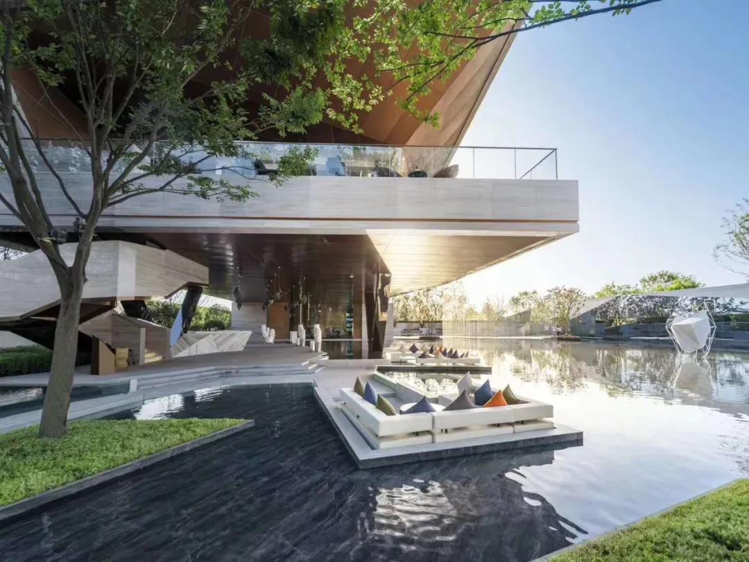 样板房巧妙地将夹层花园置于负一层,临水处设了休憩平台,可见眼前有水瀑沿着更“陡峭”的台阶落下,设计师从“山城”城市景观获得灵感,营造了垂直方向的亲水体验。