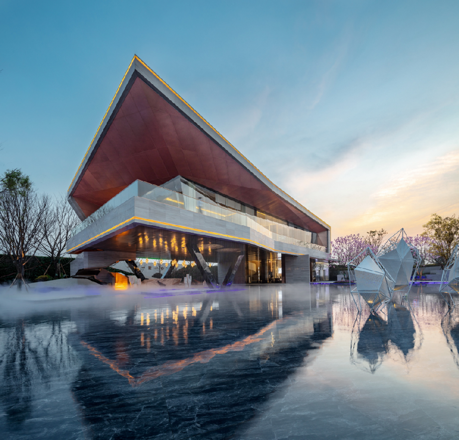 在水晶设计概念的引领下,建筑、景观、室内高度一体化。建筑一层营造了精致美好的吧台空间,水面蔓延入建筑,售楼部建筑仿若一座水晶岛屿,浮于一顷浩渺湖波之上。
