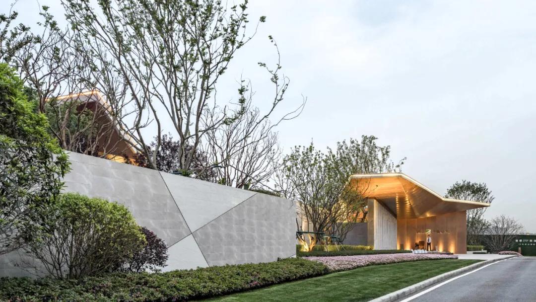 设计师以石为界,运用多种材质,以折线、几何的形态呈现一条狭长的园路,延长了对外昭示界面。两侧草丰林茂,枝叶摇曳,石墙上水纹粼粼,让人忘记纷扰,心生期待。门楼的设计呼应了水晶精致的质感,覆顶若展开的双翼,显得轻盈灵动。