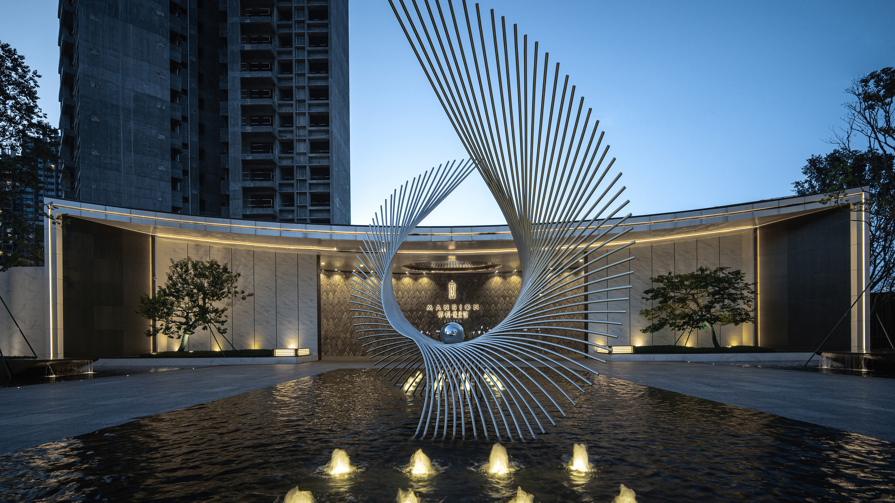 示范区入口同时作为大区永久主入口使用,对称式广场及大面积水景突显归家仪式感,设计语言统一的树池与水景,与精致灵动的艺术雕塑相结合,重新定义了城市界面。